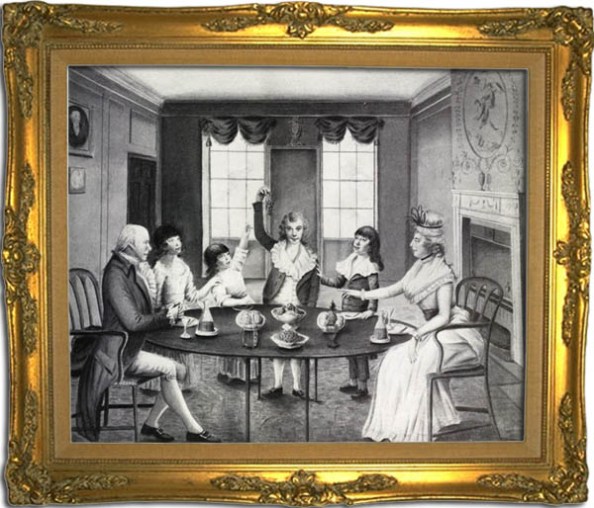 De acuerdo con Mr. Roberts, el cuadro podría ser la celebración en la familia Austen de la adopción de Edward por parte de sus parientes lejanos, los Knight, que le harían heredero de su fortuna. Edward está en el centro, es el protagonista de la escena; de izquierda a derecha se podría reconocer a Mr. Austen; Cassandra apoyando su mano sobre el hombro de la pequeña Jane; Edward; a su lado podría estar su hermano Francis, y Mrs. Austen. Los dos mayores, James y Henry posiblemente estarían en el colegio, y Charles probablemente era todavía muy pequeño y estaría con las nodrizas que se encargaban de cuidar a los bebés, de acuerdo con la tradición de la familia Austen.