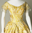 - Un vestido de noche de señora en seda dorada y blanca de 1800-1810, muy similar a los de los caracteres más acomodados de las novelas de Jane Austen.