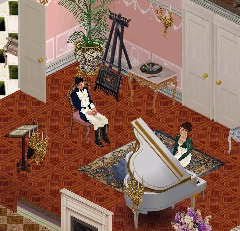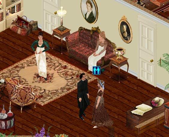 ¿Os habéis fijado en el detalle del cuadro de Mr. Darcy en la pared? La autora ha recreado distintos ambientes, con bodas incluidas. En su página vienen algunos trucos de cómo añadir algunos mobiliarios, ropa, etc. al juego que se tenga instalado.