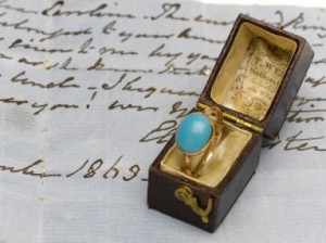 Sabiendo el gusto que tenía Jane por la joyas (no le gustaban demasiado recargadas) este anillo se ajusta perfectamente a sus preferencias, y también a su estatus social pues, si bien pudiera parecer que se trata de una turquesa (piedra muy de moda en la época de regencia), sin embargo se trata de «odontolita» (ver aquí), que se trata de hecho de piezas dentales de marfil que, tratadas con calor se vuelven azules, y así podían ser utilizadas como imitaciones de la preciada turquesa.
