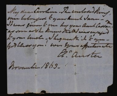 Eleanor recibió entonces el anillo de parte de Cassandra, sabiendo cuánto quería Jane a su hermano Henry. Después, Eleanor le dió el anillo a Caroline, la hija de James Austen, y que colaboró con su hermano en la primera biografía que se ha hecho de la escritora (ver más aquí, y aquí). Al no tener hijos, Caroline se lo dio a su sobrina Mary, hija de su hermano James Edward, y se fue legando en esa rama de la familia.
