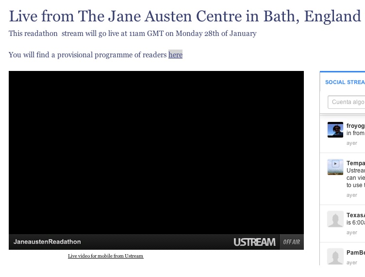 Puedes seguir en directo, a partir de las 11.00am hora inglesa, hasta las 11 pm, el maratón de lectura (readathon) que se va a hacer en directo desde la ciudad de Bath, donde numerosos participantes leerán sin interrupción Orgullo y Prejuicio: