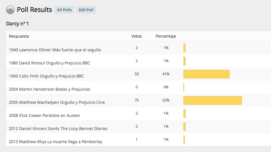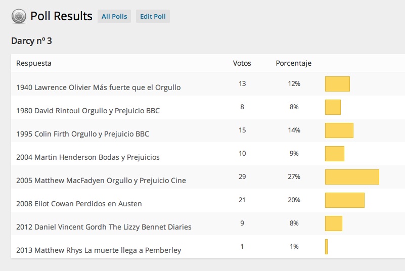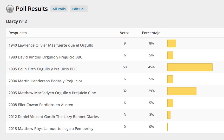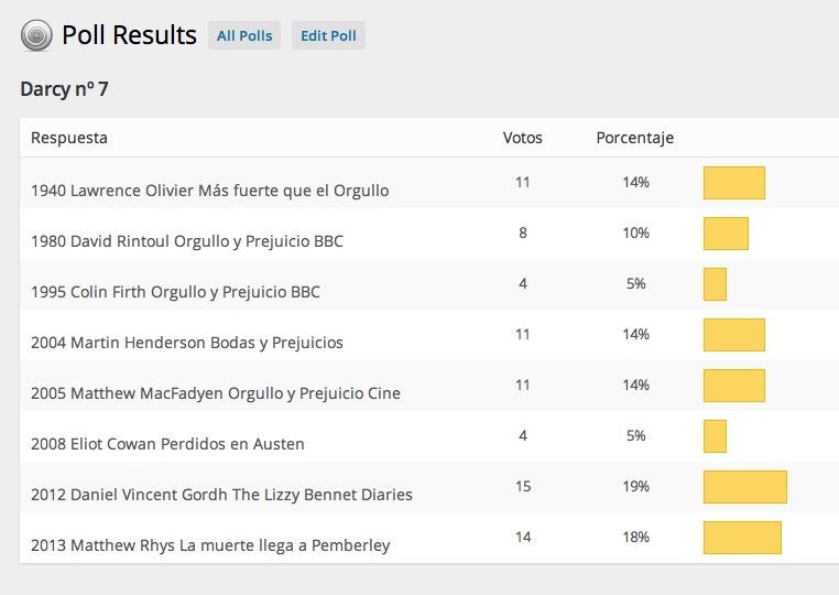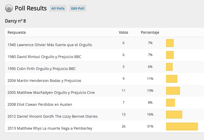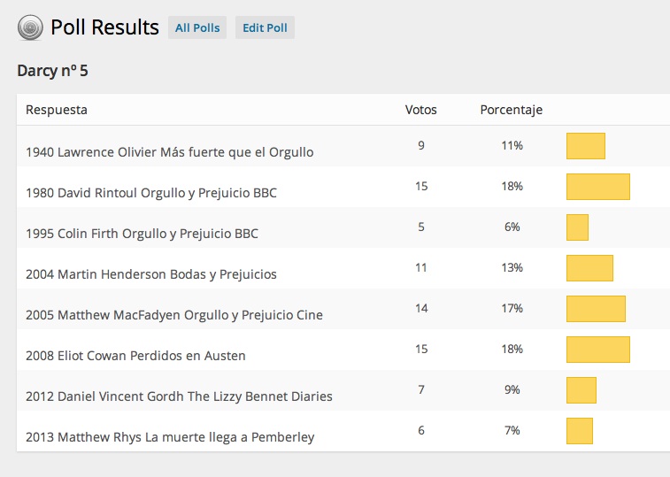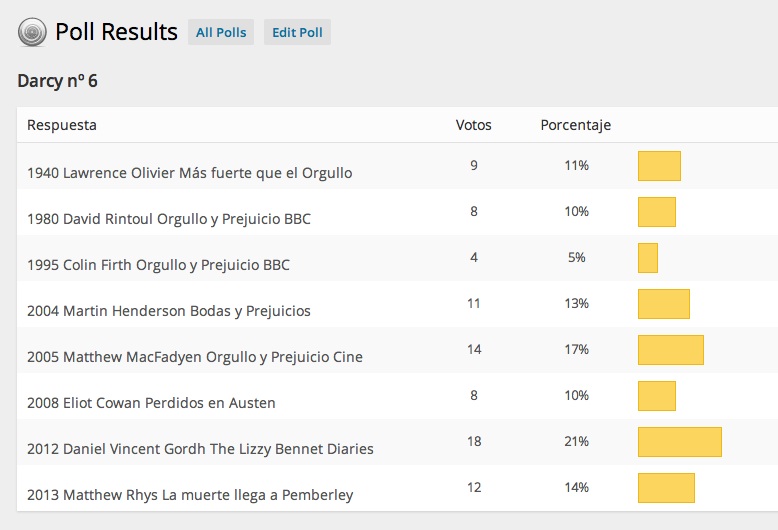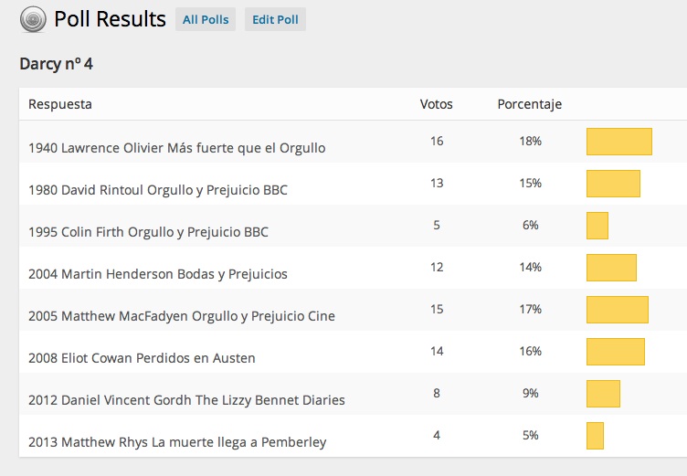 Os voy adelantando hoy cómo va el ranking para elegir a nuestro Darcy favorito. Como ya os comenté en la entrada de la encuesta, a la hora de la votación ha habido más de un despiste de gente que me ha escrito para decirme que no había votado bien (pero el sistema permite votar solamente una vez desde el mismo ordenador), o se ha detectado alguna «trampilla» de votar al mismo Darcy ocho veces, por lo que tendremos que meter un «factor de corrección» a la hora de hacer el ranking, y que os iré explicando.