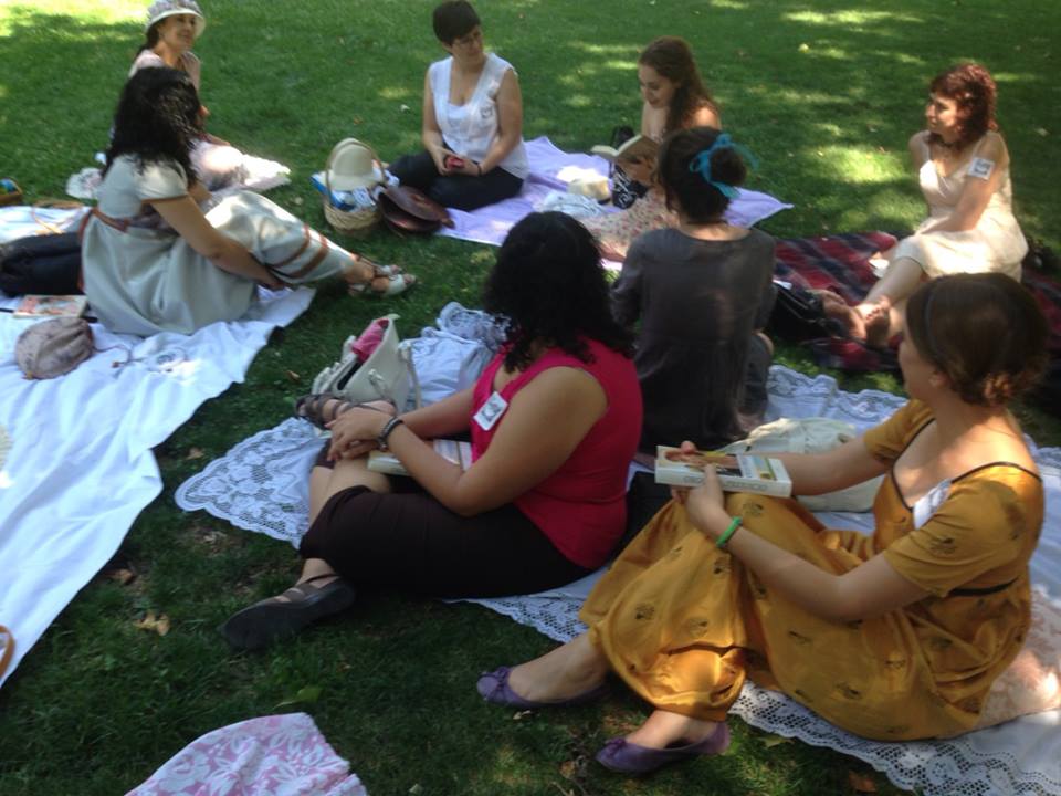 A estas alturas ya tocaba comer. Algunas habían hecho muy bien los deberes y llevaron su propia comida en su cestita regency. Otras nos acercamos a comprar unos sandwiches en un local cercano, pero el resultado fue muy bueno. Por cierto, alguien hizo un bizcocho de zanahoria y chocolate para chuparse los dedos. Tuvimos mantelitos de puntillas, servilletas de hilo, copas y vasos de lo más chic… lo dicho, un picnic con todas las letras…
