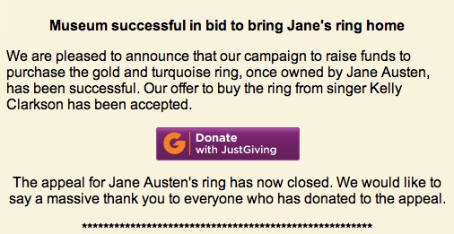 Bueno, pues polémica zanjada. La Casa Museo de Jane Austen en Chawton ha conseguido recaudar la cantidad de dinero necesaria para ofrecerle a Kelly Clarkson el dinero que pujó para conseguirlo. El anillo es una de las tres joyas pertenecientes a Jane Austen que han llegado hasta nuestros días y ahora ya será exhibida en la casa donde vivió Jane, probablemente a partir de año nuevo. Si queréis saber más sobre el asunto, al final os he puesto los enlaces de las entradas relacionadas con este tema.
