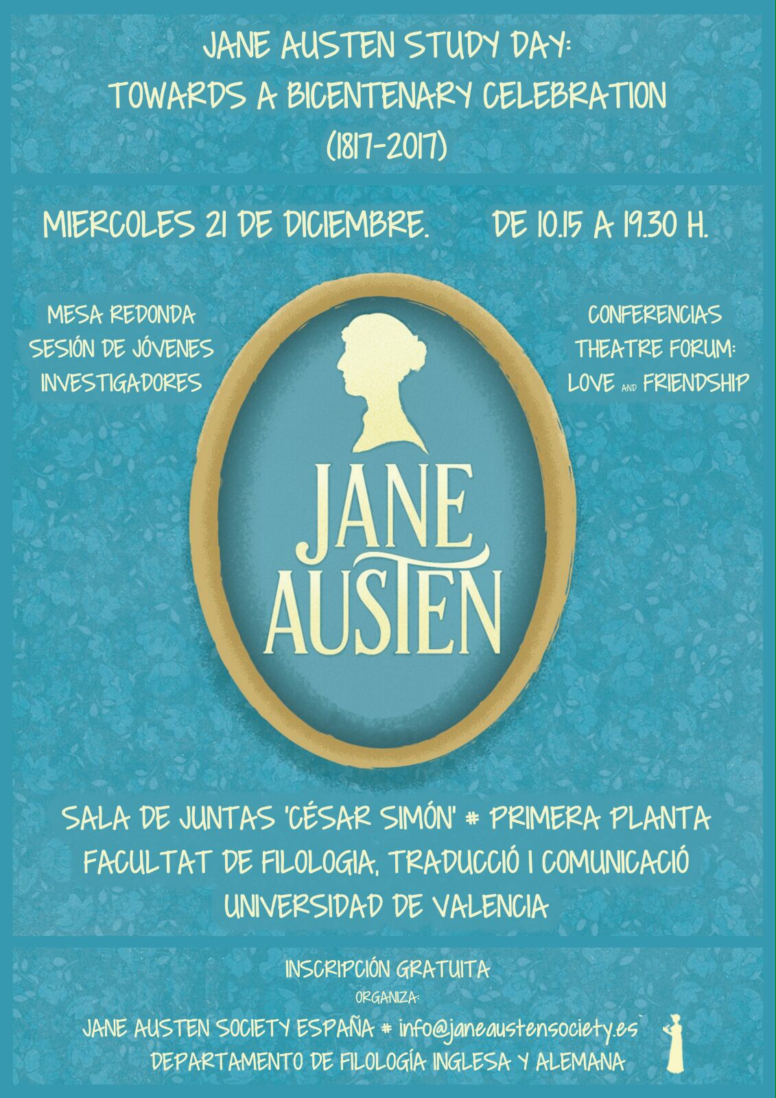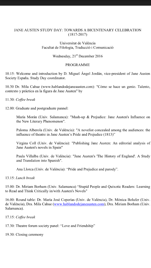 A pocos días del 41 (+200) Aniversario de Jane Austen, tendremos el placer de volvernos a encontrar en la Universidad de Valencia, en el marco de un «Jane Austen Study Day» organizado por el Vice-Presidente de la Jane Austen Society España, Miguel Ángel Jordán, quien ya impartió hace unas semanas una conferencia en este mismo enclave (ver AQUÍ), y participó en el Congreso sobre Jane Austen celebrado el pasado mes de Febrero en la Universidad CEU-San Pablo en Madrid (ver AQUÍ).