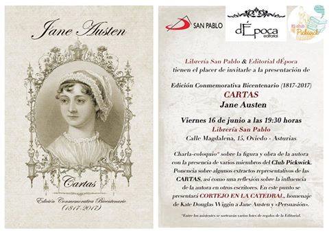 Esta tarde, a las 19.30, se celebra un HOMENAJE LITERARIO a JANE AUSTEN con la presentación de la Edición Conmemorativa de sus CARTAS en la librería San Pablo de Oviedo. Se hablará de Jane —su vida y obra— con todo el enorme cariño que siempre pone esta Editorial, y estarán acompañados de varios miembros del Club Pickwick.