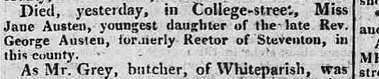 “Winchester, Saturday, July 19th: Died yesterday, in College-street, Miss Jane Austen, youngest daughter of the late Rev. George Austen formerly Rector of Steventon, in this county.”