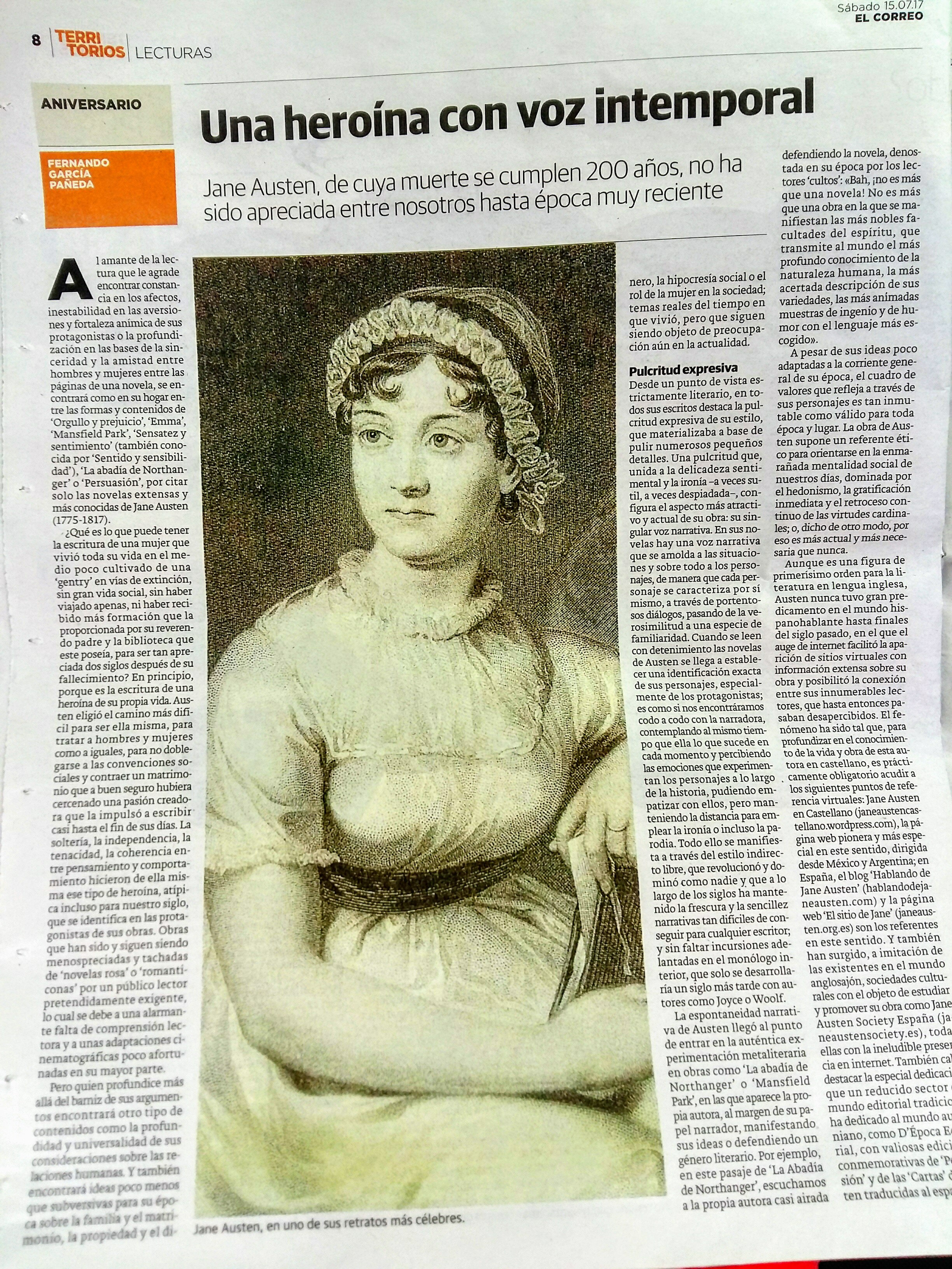 Sabréis que mucho se ha escrito estos días sobre Jane Austen, pero la mayoría «de cuyo nombre no quiero acordarme». No es así el caso del artículo escrito por Fernando García Pañeda, para el periódico el Correo. Sin duda, un artículo diferente, pero quizás el que más se aproxime a la auténtica relevancia de Jane Austen como figura literaria Universal.