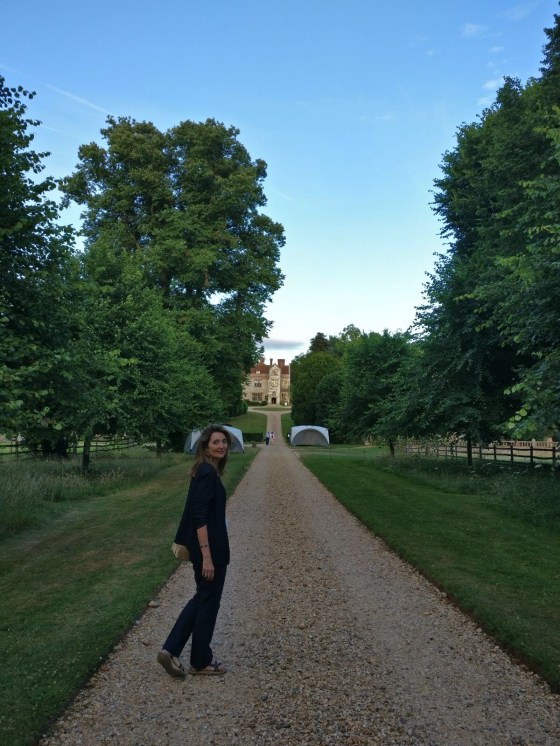 Unas cuantas fotos más y contemplación de la fachada de Chawton, y nos dirigimos, ya cayendo la tarde de ese largo e intenso día, hacia la Casa Grande de Chawton. Como os he comentado, a distancia de pequeño paseo desde el Cottage donde vivía Jane. Un caminito recto, absolutamente rural, y llegamos al inicio del paseo principal, recibidas por una una impresionante vista con el sol poniente reflejado en los cristales de la fachada…