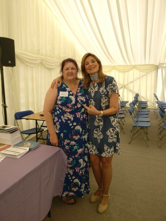 Como íbamos bastante bien de tiempo, pudimos explorar el interior de la carpa antes de que empezara la reunión. Allí nos recibió super amable la secretaria de JASUK, Sharron. Un encanto que, a pesar de estar a tope con los registros de entrada y repartiendo libros, no dudó ni un momento en posar para nosotras: